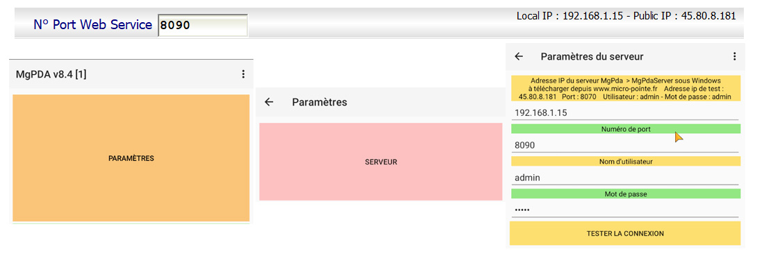 - Testez la connexion (en cas d’erreur, vérifiez que votre appareil utilise en wifi, le même réseau local du serveur MgPda sous Windows)